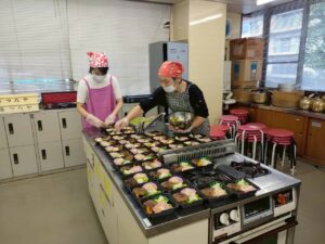 お弁当(持ち帰り用)と食堂用(食堂利用者用)を限られた時間で用意するため、役割分担を決め、チームワークを発揮し、てきぱきと食堂の準備をすすめていきます。