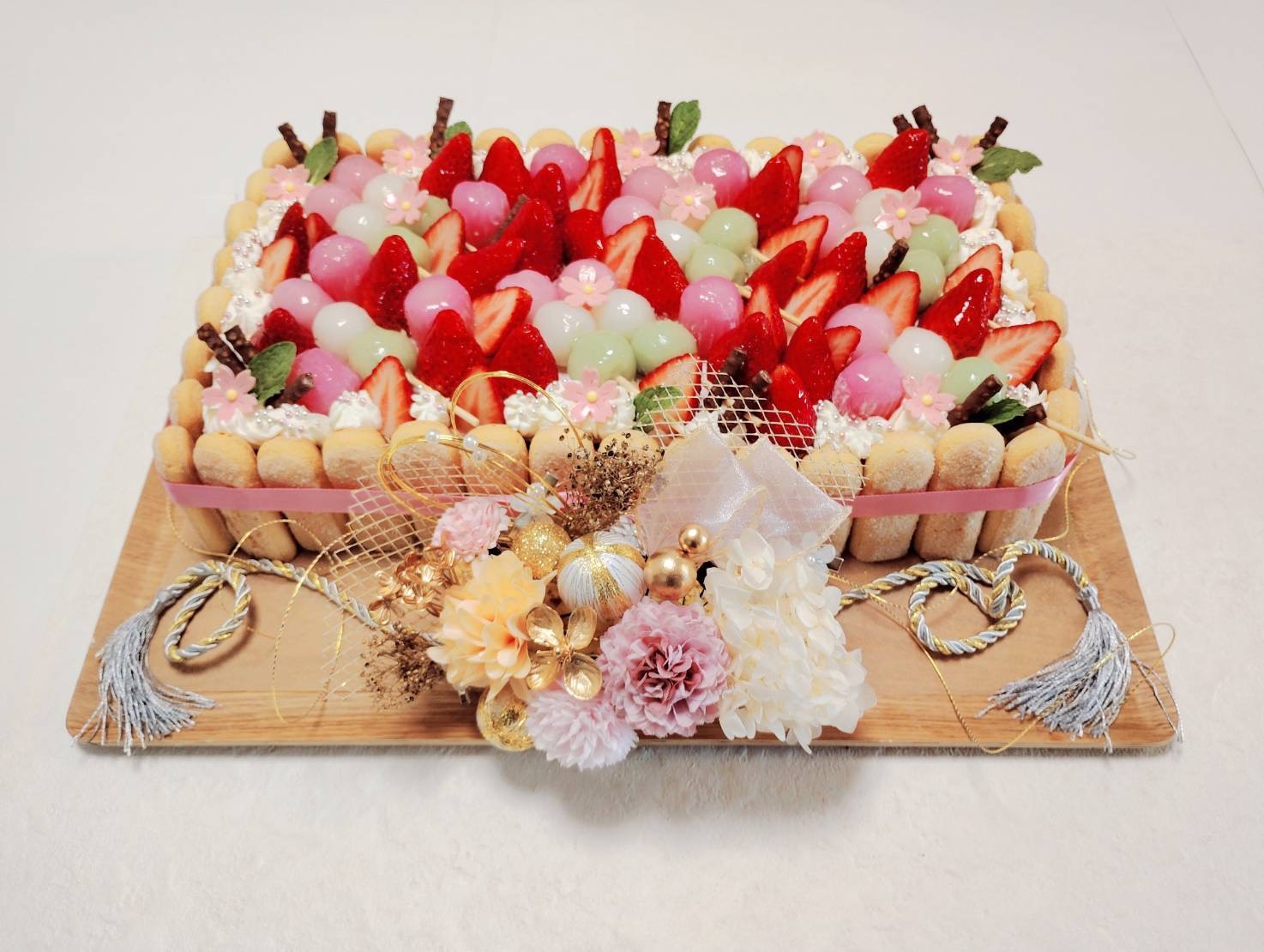 トップには、主役の苺と三色団子をたっぷり。